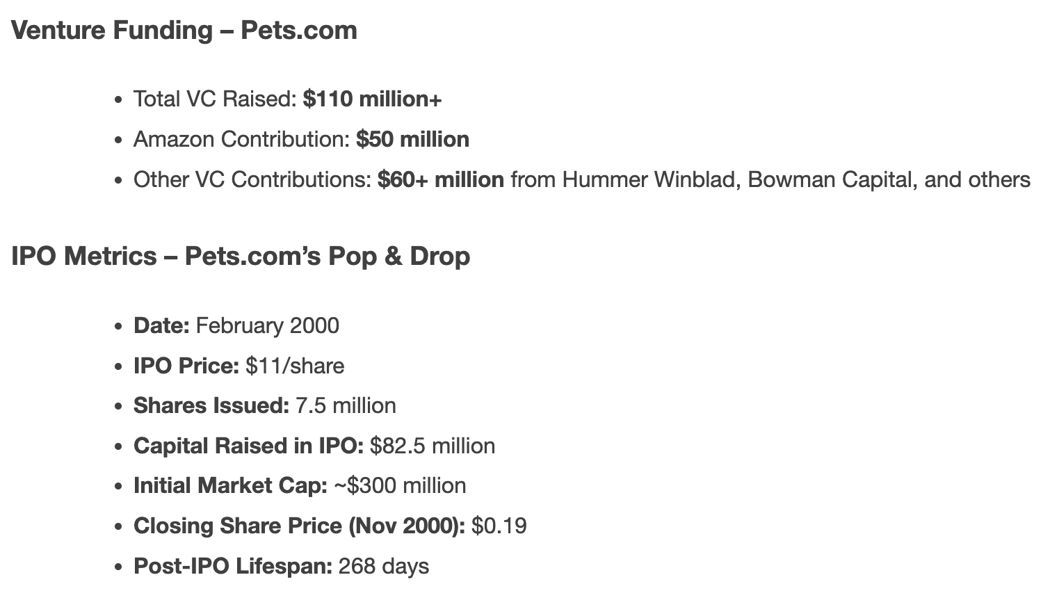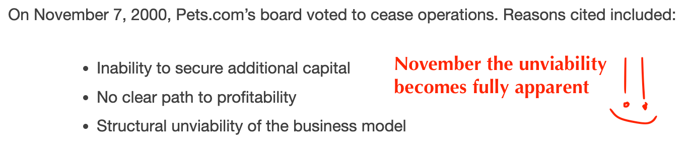 Pets.com went public at a $300M market cap, saw revenue reach under $6M in its best quarter, and spent $10M per month on ad campaigns. Darwinian logic held that the destruction of this space was necessary for human evolution.
