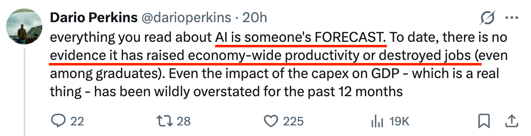 The quote above from Satya is important; remember it, because we will revisit it at the end. In this moment, there is a mile-wide abyss between the reality of AI and the forecasts of what it will achieve.