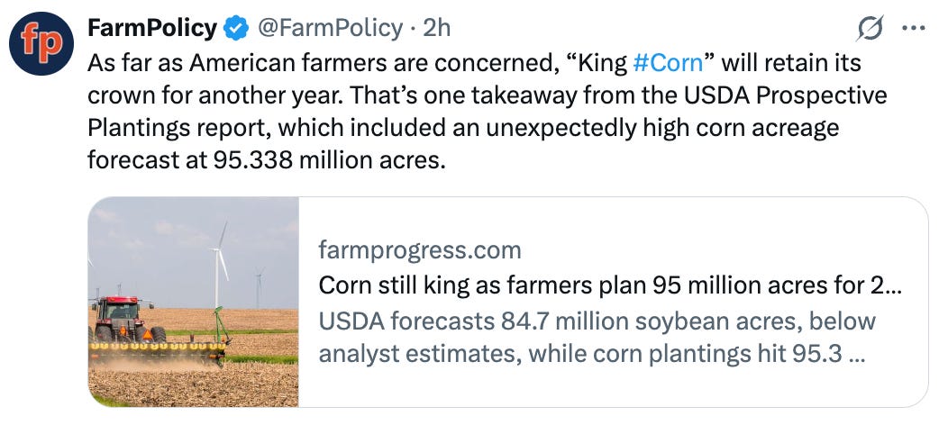 Think of these as traditional newsletters and the crowd that “blames the algos.” Mostly operate under existing assumptions. Keep digging for anecdotes that suggest “King Corn” is more confirmation of what we already knew. The U.S. farmer has favored soybeans over corn exactly once in history.