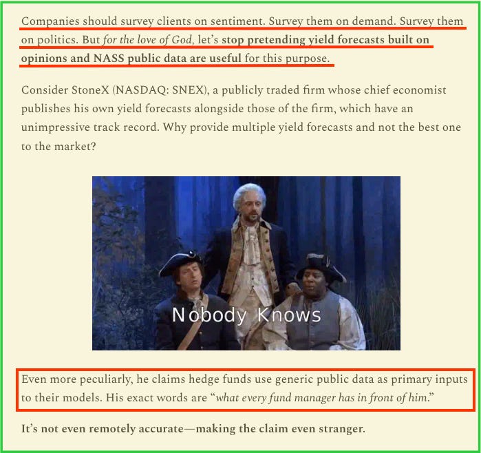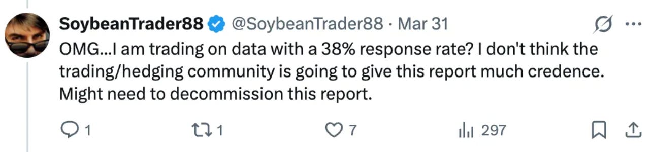 We ignore most of these private surveys because we were aware of these issues years ago. It’s well documented across all USDA industries: livestock, cotton, dairy, and others. Even at the most basic methodology level, the best companies will have the same embedded biases, only much more concentrated.